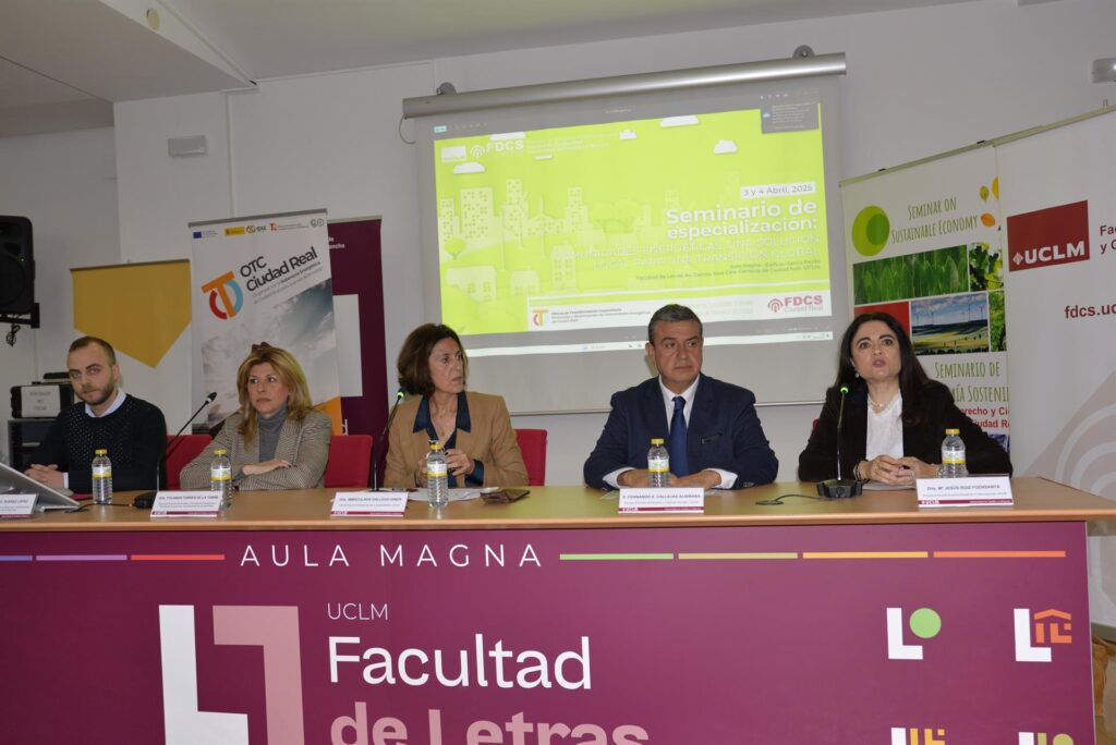 Junto a la vicerrectora y a la directora del seminario, en la inauguración del mismo han participado el decano de la Facultad de Derecho y Ciencias Sociales de Ciudad Real, Fernando Callejas; la segunda teniente de alcalde y concejal de Urbanismo y Promoción Económica del Ayuntamiento de Ciudad Real, Yolanda Torres; y José Manuel Suárez, responsable de coordinación de la Oficina de Transformación Comunitaria de Ciudad Real, oficina de reciente creación dedicada al asesoramiento, formación y promoción de las comunidades energéticas locales.